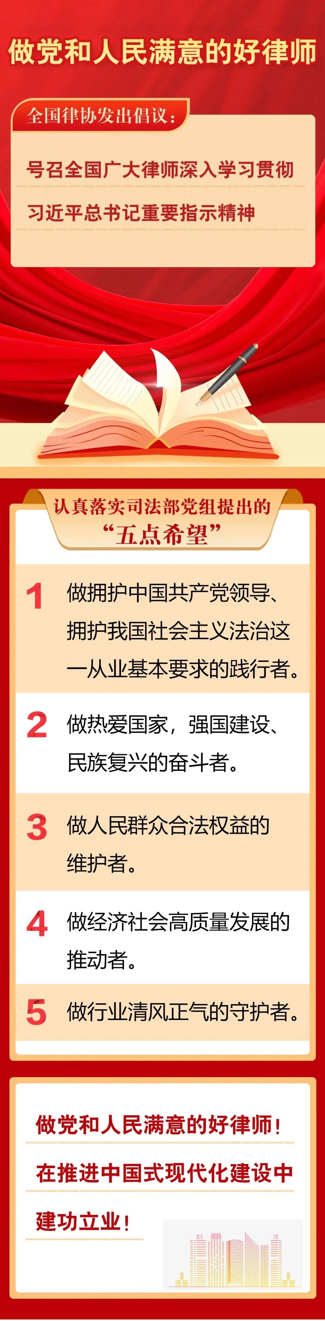 全国律协发出倡议,号召全国广大律师深入学习贯彻习近平总书记重要指示精神,认真落实司法部党组提出的“五点希望”,坚定正确政治方向,做拥护中国共产党领导、拥护我国社会主义法治这一从业基本要求的践行者;弘扬爱国主义精神,做热爱国家,强国建设、民族复兴的奋斗者;践行法治为民宗旨,做人民群众合法权益的维护者;提升专业服务能力,做经济社会高质量发展的推动者;依法诚信规范执业,做行业清风正气的守护者。积极投身社会主义法治国家建设,以做党和人民满意的好律师为最高职业追求,在推进中国式现代化建设中建功立业!